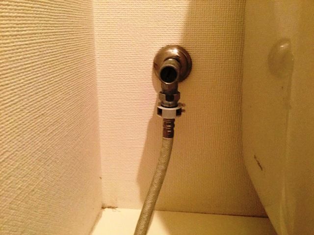 まずは、止水栓のねじ(黒いとこね)をマイナスドライバーで止まるまで回して、給水を止めます。