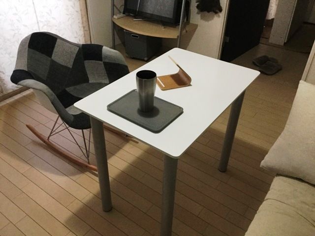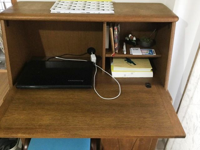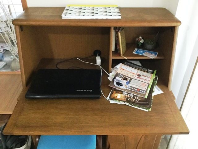 これまでモノが山積みの机がデフォルトだったからか、意識のピントが合わないと片づけなくてはと思わないらしく「狭いなぁ」と文句いいながら本を端に寄せて使用中。
