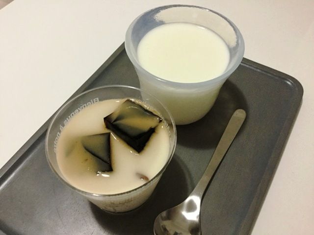 目覚めのおやつに(もう夜食の時間やで)大好物な成城石井のコーヒーゼリー。ミルクゼリーの中に賽の目カットしたコーヒーゼリーが入ってます。